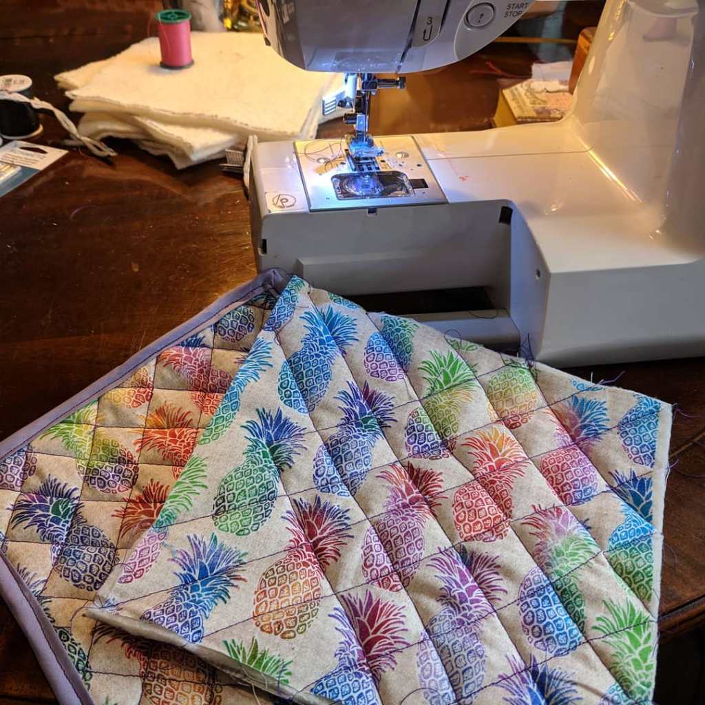 After practicing, we dove right into quilting. I’d put up to a vote whether we wanted to work on tote bags or potholders, and potholders won out. My goal either way was to discuss a bit of quilting, batting/interfacing, and bias tape. We spent most of the class making quilted potholders. Drawing seam lines, pinning and stitching, and binding the edges took a while, though both students were successful.